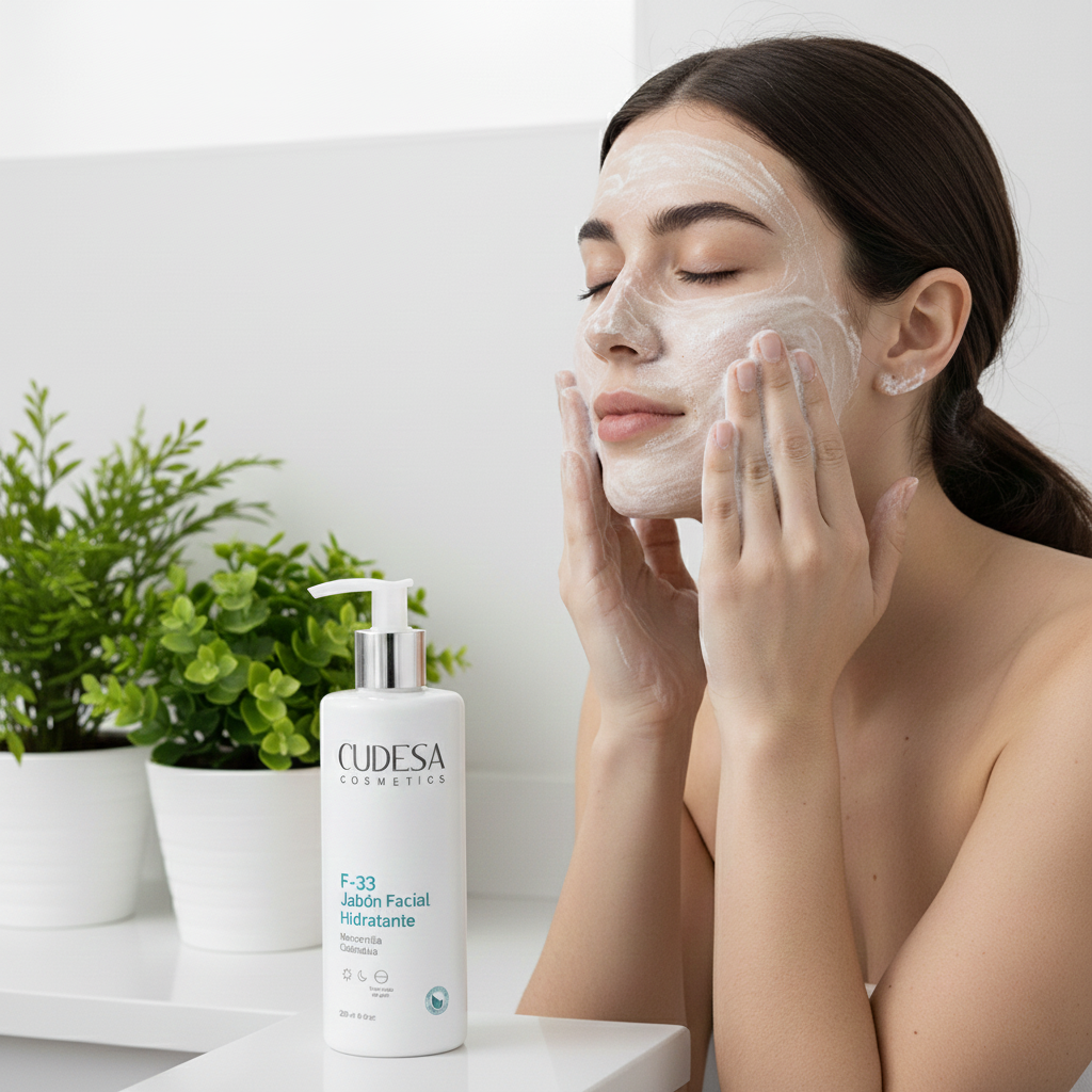 Se recomienda aplicar el Jabón Facial en la mañana y en la noche sobre la piel previamente humedecida, masajear de manera circular rostro y cuello, retirar con abundante agua, y luego secar suavemente. Seguir con la rutina sugerida por Cudesa Cosmetics.